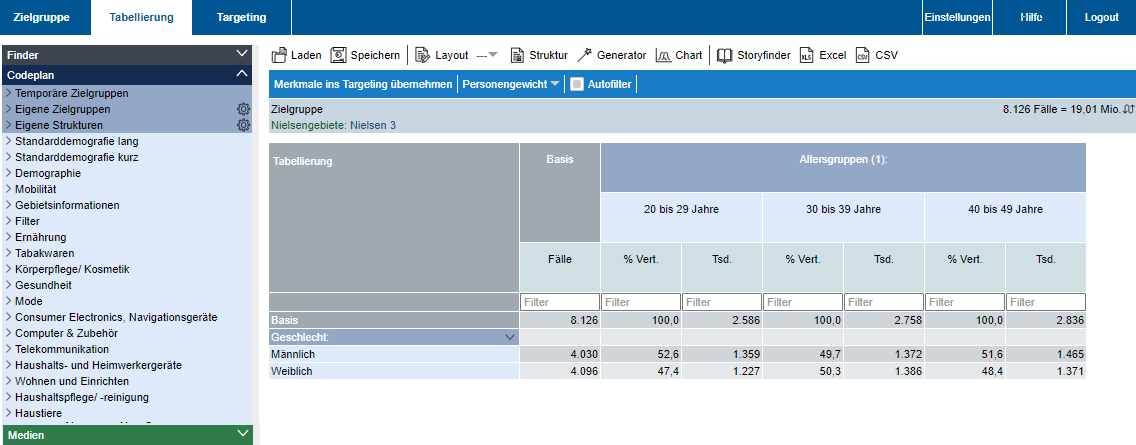 Nach dem Einloggen starten Sie direkt im Modul Tabellierung. Das Modul Zielgruppe ist für die Erstellung komplexer Zielgruppen vorgesehen, über Targeting können die Zielgruppen der Auswertungstabelle visualisiert werden.