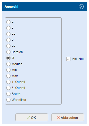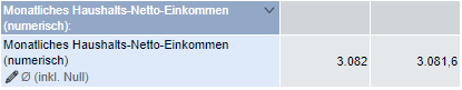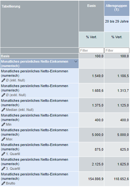 Das Symbol Ø bedeutet, dass der ausgewiesene Wert als Durchschnitt über alle Einträge berechnet wurde. Unabhängig von der gewählten Darstellung, wird der Wert immer in der Währung der Variablen ausgewiesen, Einkommen in Euro, Alter in Jahren etc.
