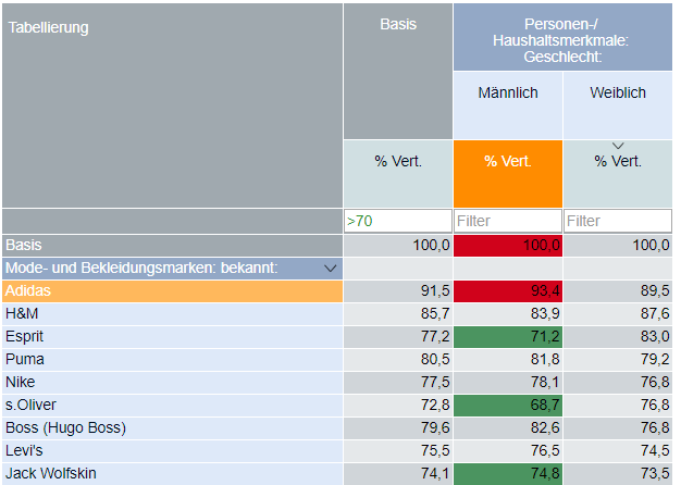 Es ist möglich, entweder einen Wert/ Wertebereich vorzugeben oder Quantile zu definieren. Für die Formatierung über Quantile werden die Daten der Spalte prozentual aufgeteilt. Über die Auswahl Quantil wird dann der definierte Anteil der Ergebnisse farblich formatiert.