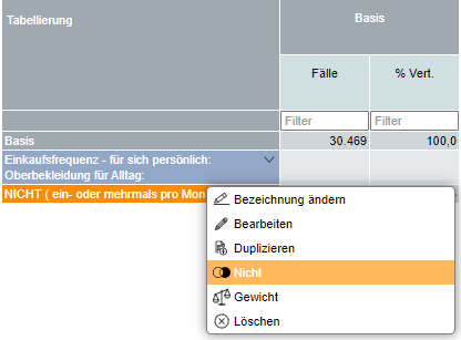 Über die Auswahl im Menü der rechten Maustaste kann der Nicht-Operator gewählt werden, um die Komplementär-Menge einer Zielgruppe zu definieren.