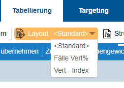 Auf der Programmoberfläche können Sie über das Pulldown-Menü rechts neben dem Button Layout die Liste Ihrer gespeicherten Profile aufrufen, um das Tabellenlayout der aktuellen Auswertung zu ändern. Bei Programmstart wird das als Standard definierte Tabellen-Layout geladen.