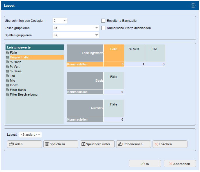 Eine Layout-Definition umfasst die Darstellungs-Vorgaben für den Tabellenkopf (Leistungswerte), die Basisspalte (Basis) und für die Basisspalte des Autofilters (Autofilter).