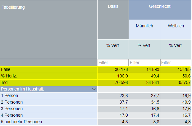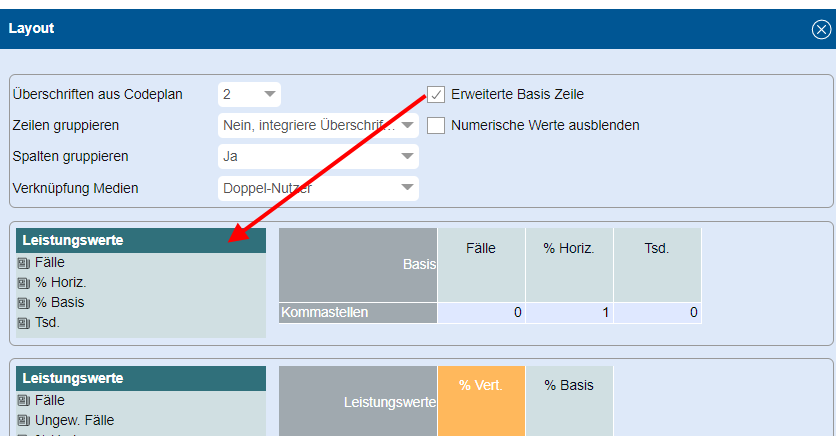Mit Auswahl der erweiterten Basis können in der Basiszeile der Tabelle mehrere Leistungswerte dargestellt werden. Dies ermöglicht die Ansicht verschiedener KPIs der Zielgruppen im Tabellenkopf auf einen Blick.