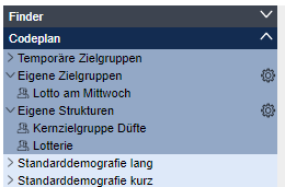 Gespeicherte Zielgruppen- , Spalten- und Zeilendefinitionen werden am Anfang des Codeplans in den Ordnern Eigene Zielgruppen oder Eigene Strukturen unterhalb der temporären Zielgruppen angezeigt.