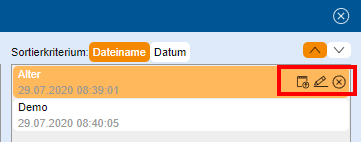 Über das Stift-Symbol kann die Datei umbenannt, über das Kreuzsymbol gelöscht werden.