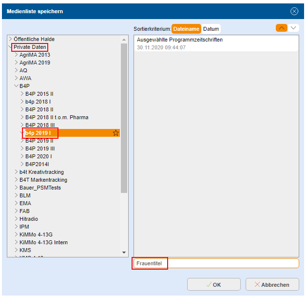 Abgespeicherte Medienlisten sind in anderen Studien verwendbar.