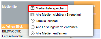 Medienlisten speichern Sie in der Rangreihe oder im Streuplan über einen rechten Mausklick auf den Tabellenkopf.