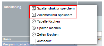Spalten und Zeilen einer Tabelle speichern Sie über das Feld Tabellierung bzw. Medientitel (in Rangreihe und Streuplan) im Tabellenkopf.