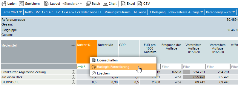 Die bedingte Formatierung ist über das Kontextmenu verfügbar