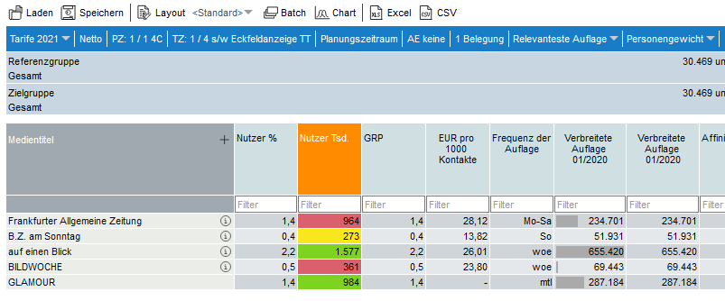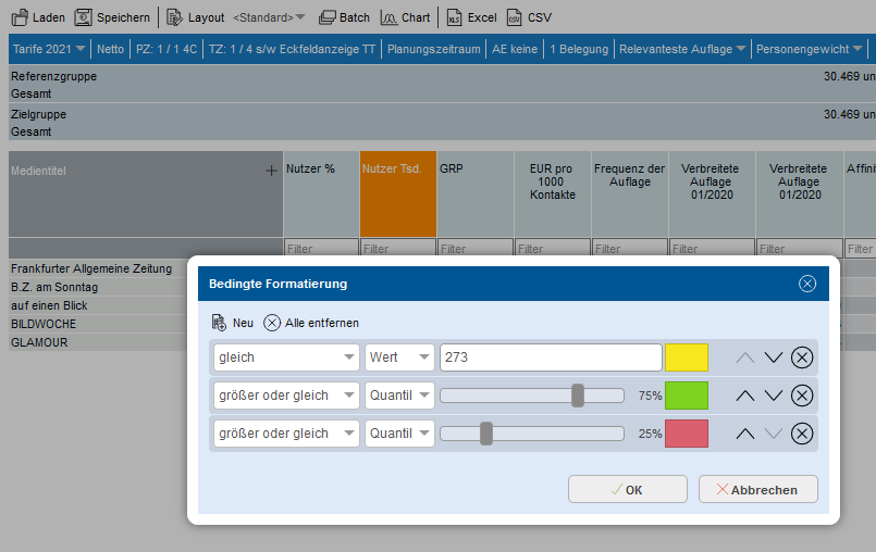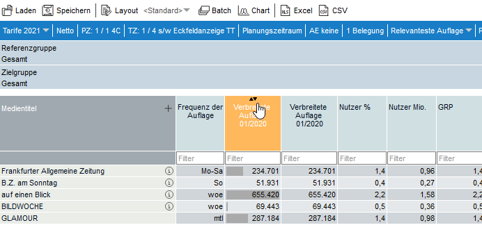 Die Rangreihe kann analog zur Tabellierung individuell angepasst werden. Medien können sortiert, Wertebereiche gefiltert und bedingte Formatierungen eingerichtet werden. Spezifisch für die Rangreihe ist die Darstellung von Histogrammen.