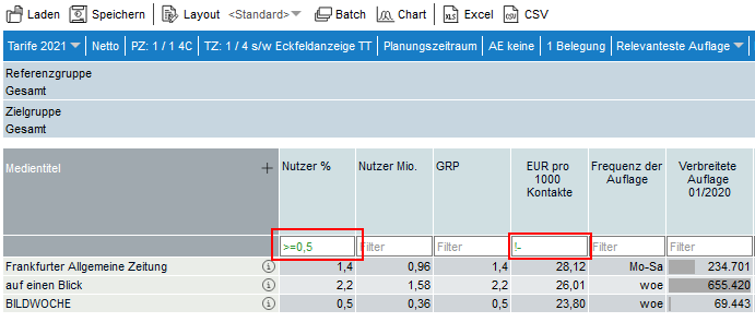 Über die Eingabe einer Bedingung im Feld Filter unterhalb des Leistungswertes werden die Zeilen der Tabelle eingeschränkt.