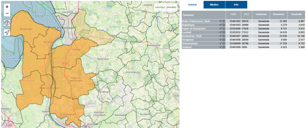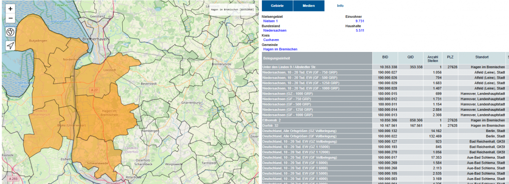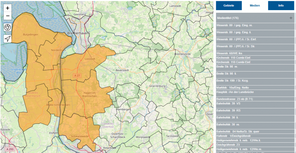 In der Auswahl Medien werden alle Stellen der ma OutofHome im ausgewählten Gebiet aufgeführt, die regional zugeordnet werden können. Die Liste der Titel kann über verschiedene Kategorien gefiltert werden.