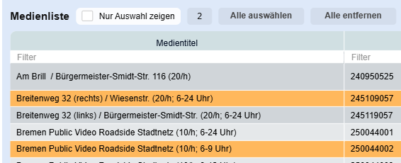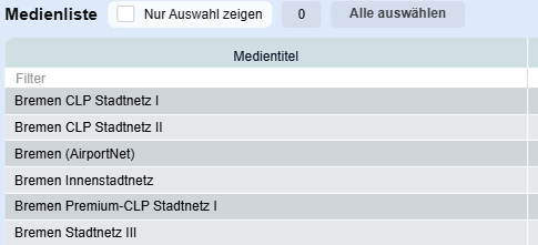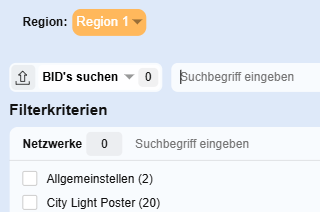 Sobald neben Gesamt eine weitere Region individuell definiert ist, werden im Medienfilter die Filterkriterien angepasst. Die Werte in Klammern sind die noch verfügbaren Einzelstellen/Netzwerke, die sich hinter dem jeweiligen Filterkriterium befinden.