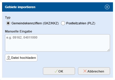 Über das Feld Gebiete importieren lassen sich Gebiete auf zwei Arten importieren: