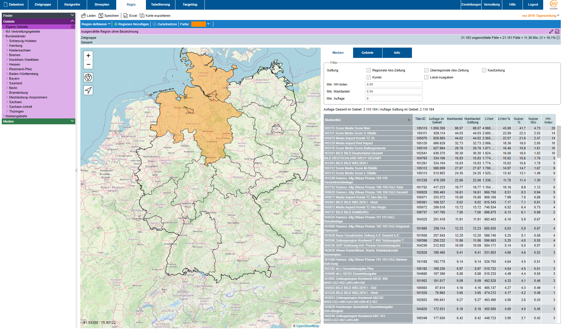 Regio unterstützt die detaillierte Planung mit der ma Tageszeitung auf regionaler Ebene. Eine interaktive Kartografie ermöglicht dem Planer die Definition seines Planungsgebiets bis hinunter auf Gemeindeebene. Mit der Auswahl des Gebiets werden für die im ausgewählten Gebiet erscheinenden Zeitungsbelegungen Informationen wie Nettoreichweite, Auflage, LWert und Marktanteil angelistet. Die Auswahl der Titel kann über die Gattung sowie Mindest-Haushaltsindex -Marktanteil und -Auflage eingeschränkt werden.