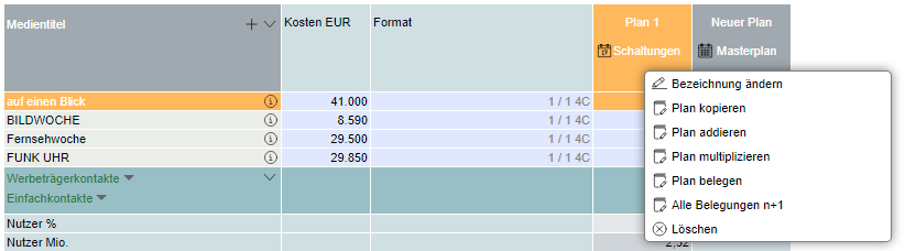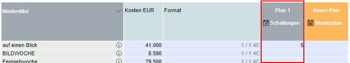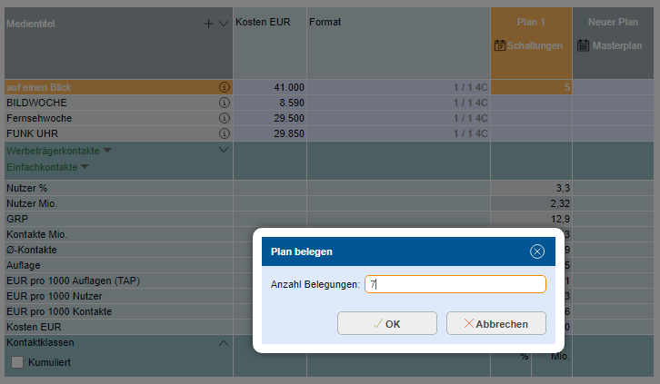 | Plan belegen | Alle Medien werden mit der gleichen Anzahl von Belegungen versehen. |