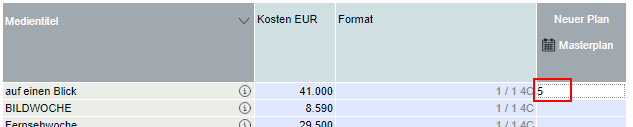 Frequenzen können direkt im Arbeitsbereich eingegeben werden. In der Spalte Masterplan in die gewünschte Zelle klicken, einen Wert eingeben und mit [Enter] bestätigen. Es wird automatisch ein neuer Plan erstellt und als zusätzlich Spalte angezeigt.