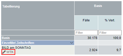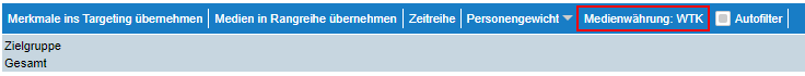 Medien werden in der Tabellierung standardmäßig mit der „Währung“ WTK (Werbeträgerkontakte) eingefügt. Dokumentiert wird die Medienwährung in der Zeile oberhalb der Tabelle.