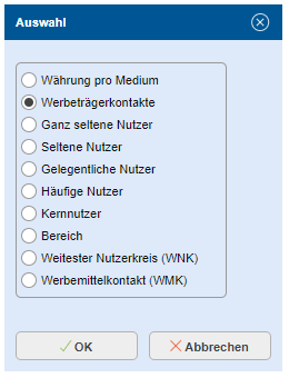 Der gewählte Leistungswert gilt für alle Medien in der Tabelle. Über die Auswahl Währung pro Medium kann der Leistungswert für jedes einzelne Medium in der Tabelle per Klick auf das Icon geändert werden.