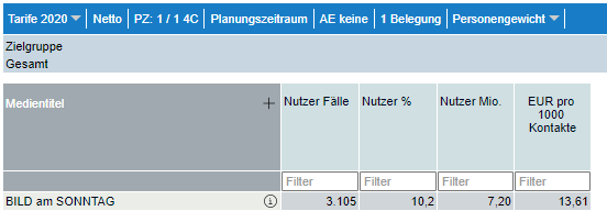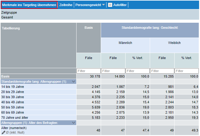 Mit Klick auf diese Auswahl werden alle Elemente der Vorspalte und des Tabellenkopfes in das Modul Targeting übernommen.