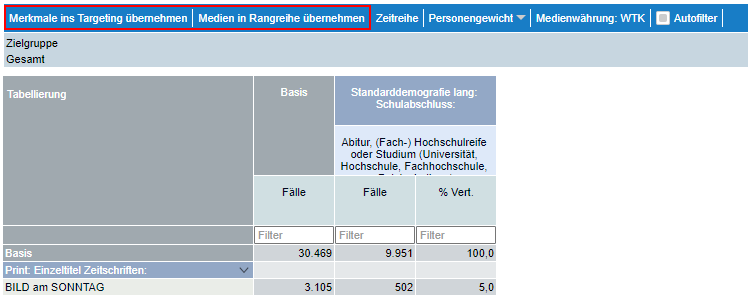 Übernehmen Sie mit einem Klick Ihre Merkmale in das Modul Targeting oder die Rangreihe und arbeiten Sie dort nahtlos weiter.