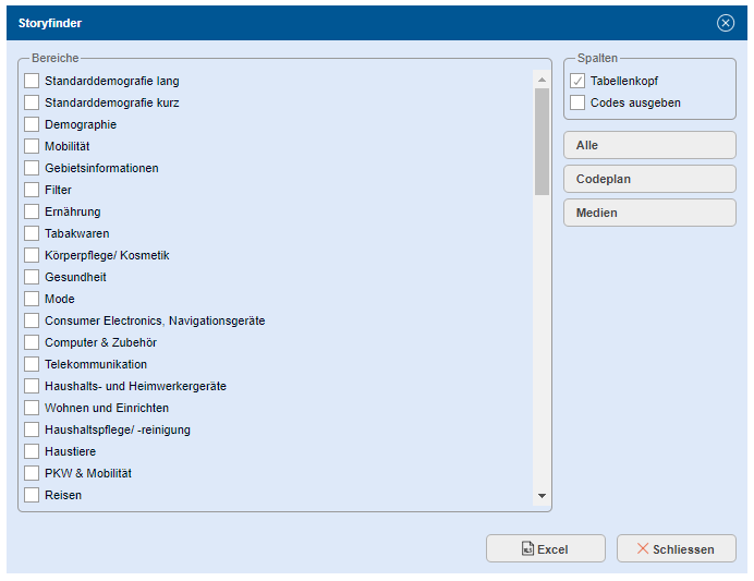 Die Funktion Storyfinder bietet die Möglichkeit, eine Zählung über alle Merkmale der ausgewählten Studie zu erstellen. Die Ausgabe der Tabelle erfolgt direkt nach Excel. Filter und Spaltenköpfe sind beliebig wählbar.