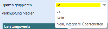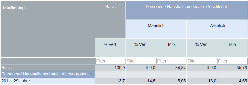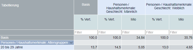 In der Standarddarstellung werden Merkmale in den Spalten des Tabellenkopfes auf zwei Ebenen beschrieben: die Merkmalsüberschrift wird in der oberen Zeile, die Ausprägungen in der zweiten Zeile des Tabellenkopfes ausgewiesen. Die Anpassung der dargestellten Überschriften erfolgt analog der Gruppierung von Zeilen.