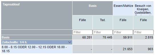 Um Zeitschnitte zu zählen, muss eine Tätigkeit oder ein Medium aus dem Ordner Tagesablauf mit dem Zeitschnitt verknüpft oder in der Tabelle gekreuzt werden.