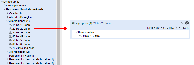 Per Drag & Drop ziehen Sie Ihre Zielgruppe direkt aus dem Codeplan der Studie auf den Arbeitsbereich. Das Potenzial wird sofort angezeigt, bei verknüpften Zielgruppen das Potenzial der Gesamtzielgruppe, wie auch das jeder Teilzielgruppe.